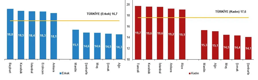 Türkiye genelinde MES, 2024 yılında kadınlar için 17,6 yıl, erkekler için ise 16,7 yıl oldu. Kadınlarda en yüksek MES değeri Tunceli'de, erkeklerde ise Bayburt'ta gerçekleşti. Erkeklerde Bayburt'u Karabük, İstanbul, Erzincan ve Ankara izlerken; kadınlarda Tunceli'yi Karabük, İstanbul, Ankara ve Rize izledi.