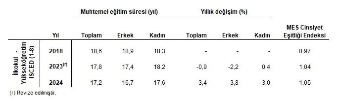 İlkokula başlama çağındaki bir bireyin en yüksek eğitim kademesini tamamlayana kadar eğitim hayatında geçirmesi muhtemel süre bir önceki yıla göre toplamda %3,4 azaldı. MES, erkeklerde 2023 yılına göre %3,8'lik azalış ile 16,7 yıl olurken, kadınlarda %3,0'lık azalış ile 17,6 yıl oldu.