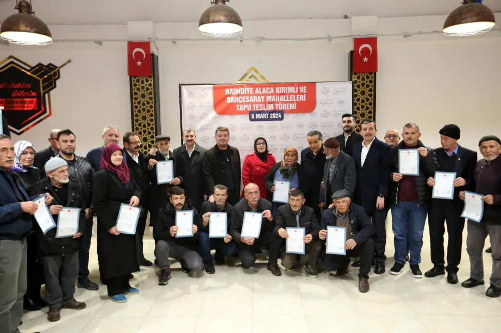 Belediye Başkanı Dr. Evren Dinçer, Hamidiye Alaca Mahallesi'nde uzun yıllardır süren tapu meselesini çözüme kavuşturarak Hamidiyelilere tapularını teslim etti. Tapu teslim törenine Belediye Başkanı Dr. Evren Dinçer ile birlikte katılan Milletvekilleri Cengiz Aydoğdu ve Hüseyin Altınsoy Hamidiyelilerin tapu sevincine ortak oldu. Milletvekili Aydoğdu, "Evren Başkan tapu meselesinin çözümünde her belediye başkanın alamayacağı riskleri göze aldı" dedi.