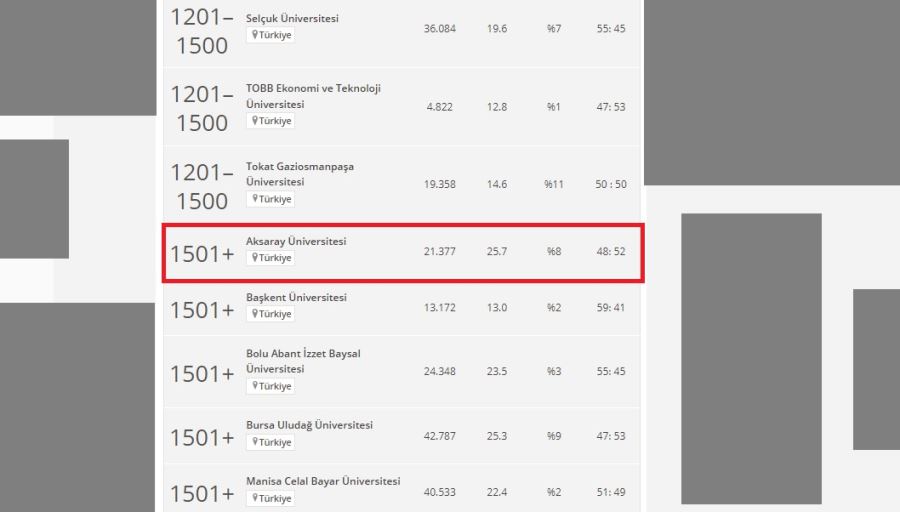 Dünyanın en prestijli akademik derecelendirme kuruluşlarından birisi olan Times Higher Education (THE), “Dünya Üniversiteler Sıralaması 2023” listesini kamuoyu ile paylaştı. Listeye girebilen 67 Türk üniversitesi arasında yer alan Aksaray Üniversitesi (ASÜ) 1501+ bandında.