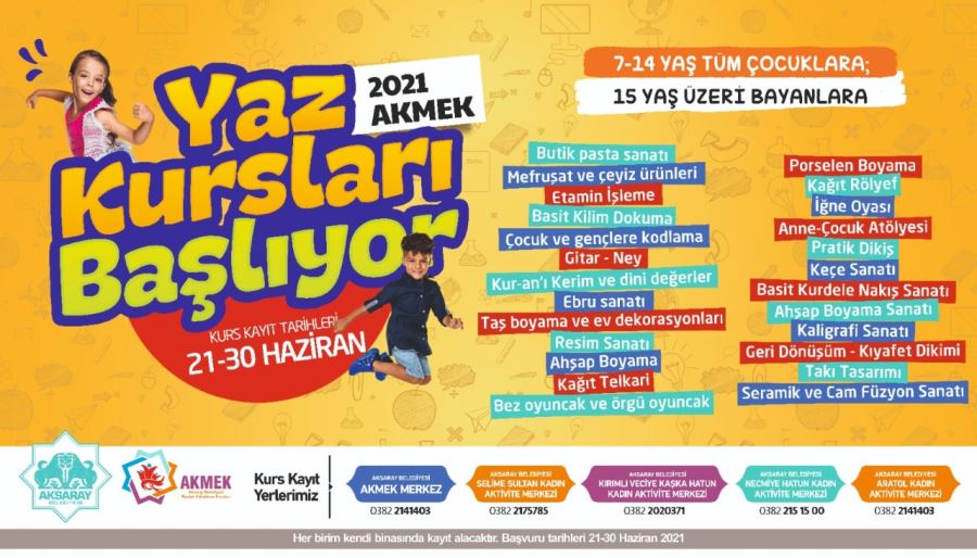 Kadınların sosyal hayata daha etkin katılımını sağlamak amacı ile sürekli yeni projeler hayata geçiren Aksaray Belediyesi, AKMEK ve Kadın Aktivite Merkezlerinde düzenlenecek kurslar için kayıtlara başlıyor.